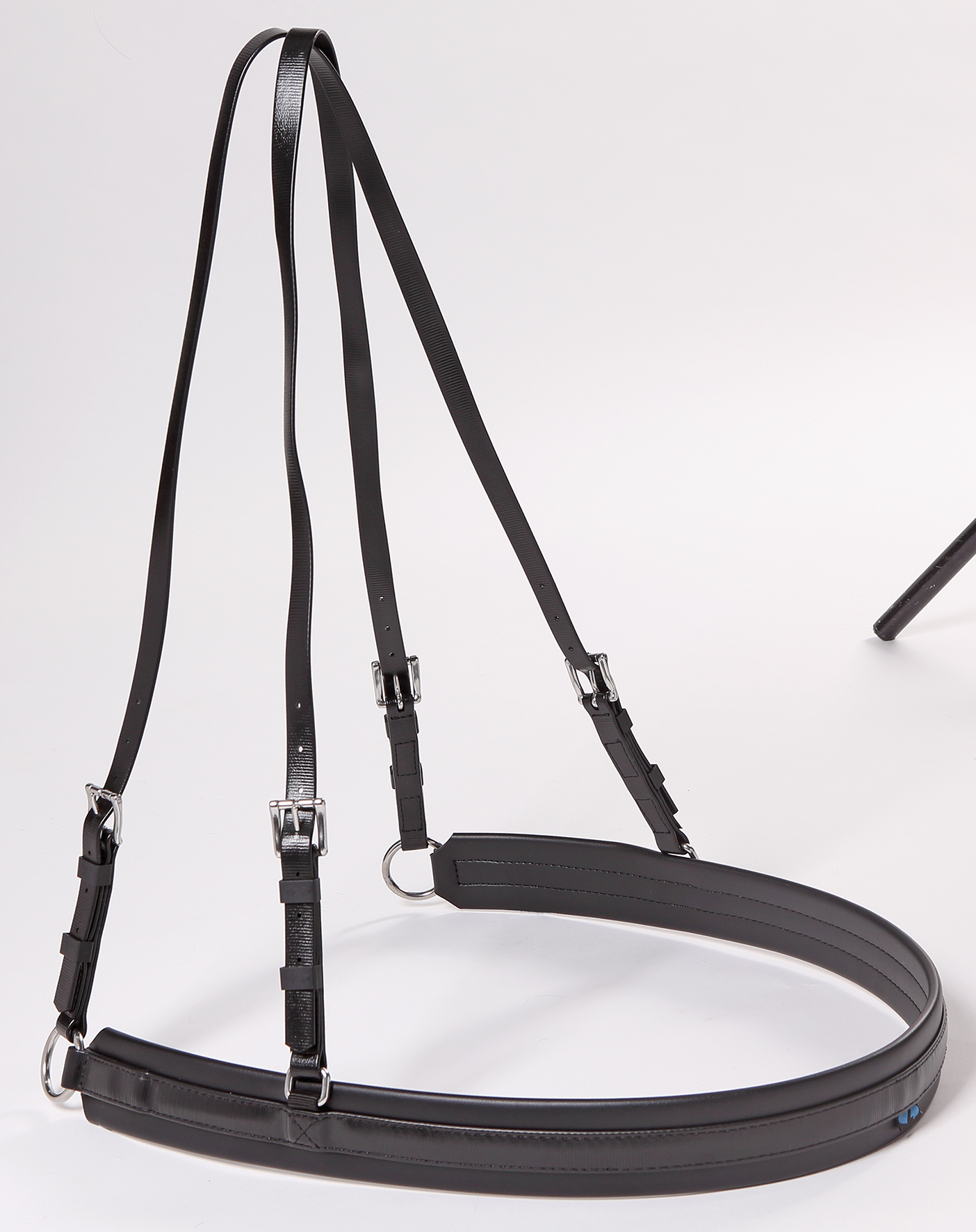 Breeching is essentially part of the braking system for the harness. It is fitted around the rear end of the horse. As the horse slows, it uses the breeching to provide a means with which to hold the vehicle from running on. Breeching is not generally used on leader horses (in tandem or team), as this function is taken care of by the wheeler horses. Some drivers also choose not to use breeching where the vehicle is very light and/or has very efficient braking systems – particularly on modern vehicles with disk brakes. SL breeching is an elegantly styled, lightweight breeching with a single hip strap.