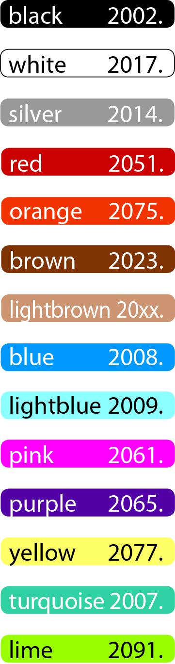 Koordkleuren: Zwart, Wit, Zilver, Rood, Oranje, Bruin, Lichtbruin, Blauw, Lichtblauw, Roze, Paar, Geel, Turqoise en Lime.