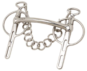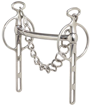 Liverpool bits are the most commonly used of the driving harness bits. This model has a stainless steel plain mullen mouth. It comes complete with a single link curb chain.