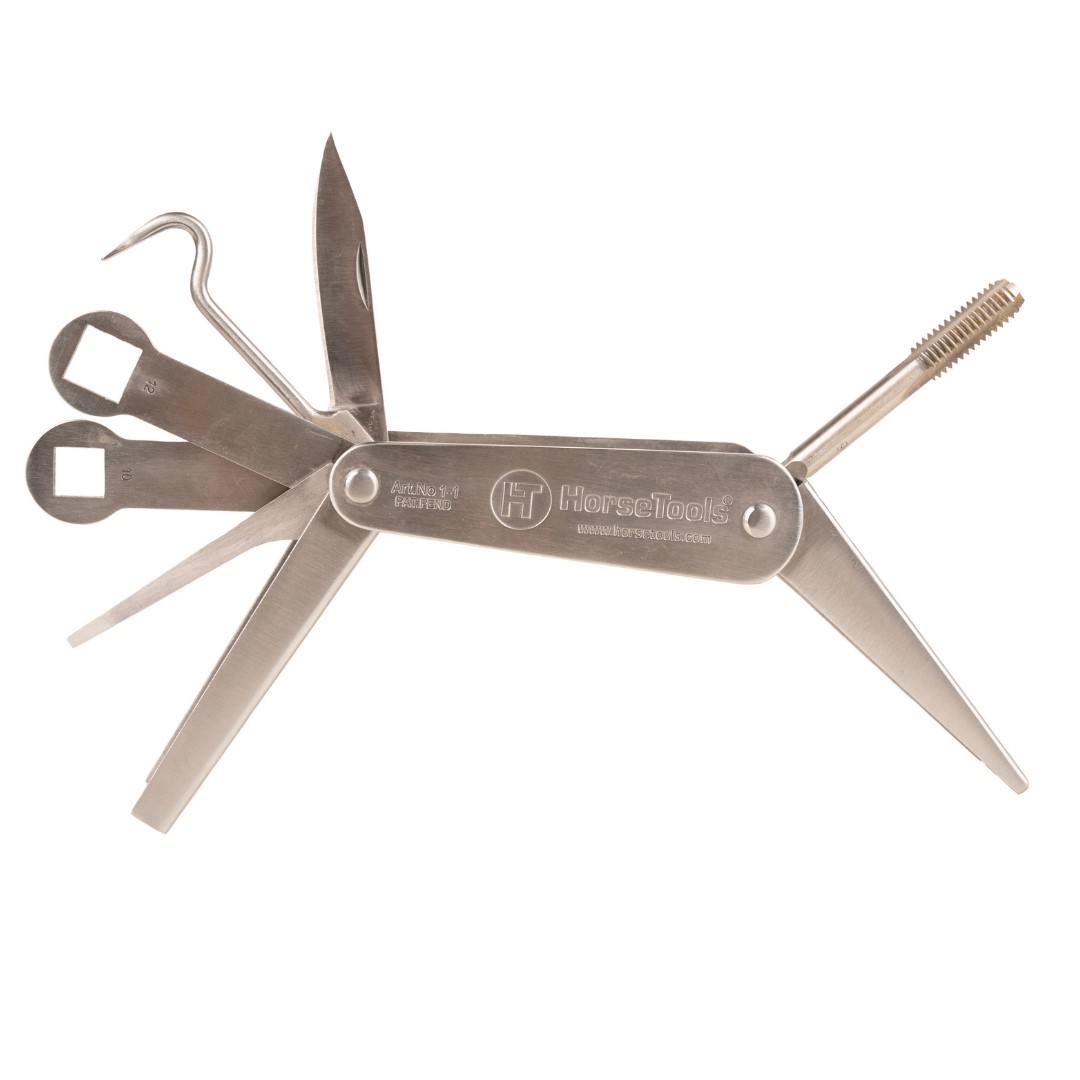 Bevat een hoevenkrabber, reiniger, 3/8” schroefdraad tap, vierkante sleutels in vier maten (10, 12, 13, 14 mm) en een mes.