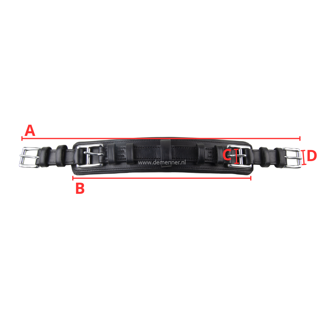 | Maat | A. Totale lengte | B. Voering lengte | C. Breedte binnengesp | D. Breedte buitengesp |